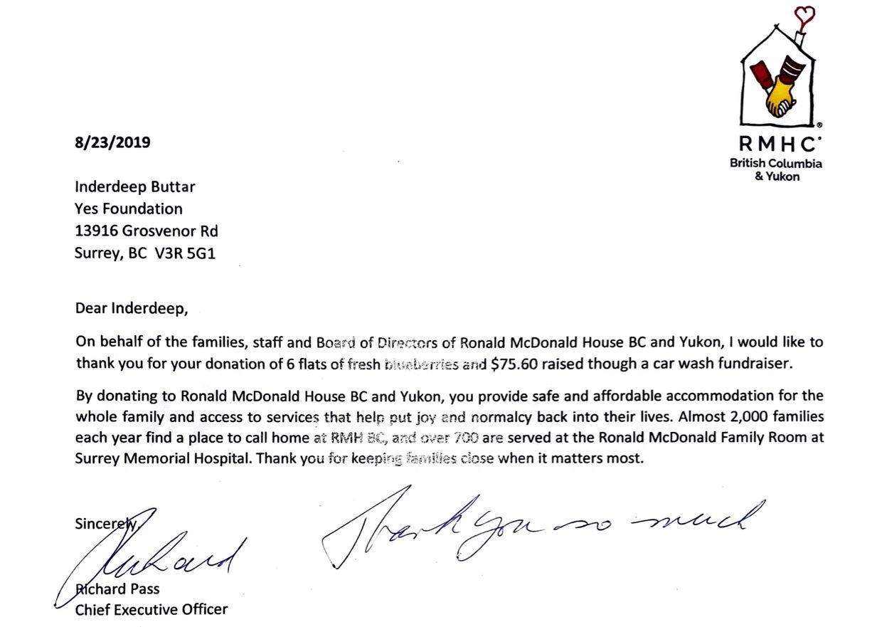 Big shout out to one of our community partners, Ronald McDonald House, for their amazing thank you letter! Special thanks to our amazing team and Co-Founders, Inderdeep Kaur Buttar and Hershdeep Singh Buttar! Check out the website of RMH BC & Yukon and please support them in whichever way you can.